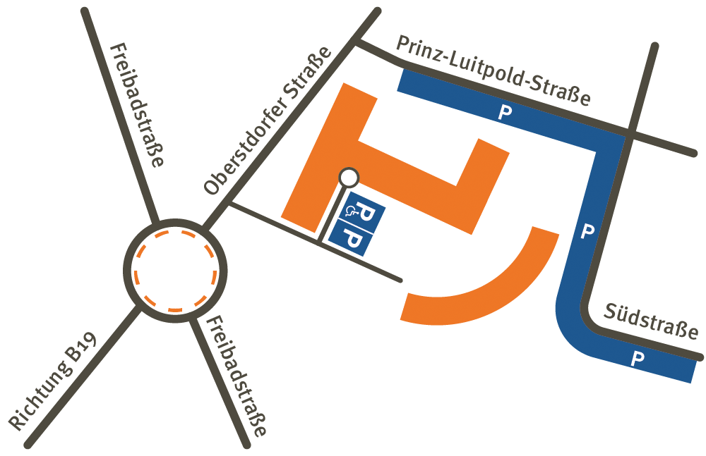 - Beim Kreisverkehr nehmen Sie die erste oder zweite Ausfahrt und parken in den ausgewiesenen Parkplätzen in den Seitenstraßen rund ums Klinikgelände